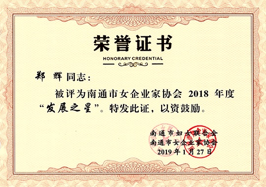 南通三圣集團副董事長(cháng)鄭輝女士被南通市婦女聯(lián)合會(huì )、南通市女企業(yè)家協(xié)會(huì )評為2018年度“發(fā)展之星”,全南通市僅有8位女企業(yè)家獲此殊榮。